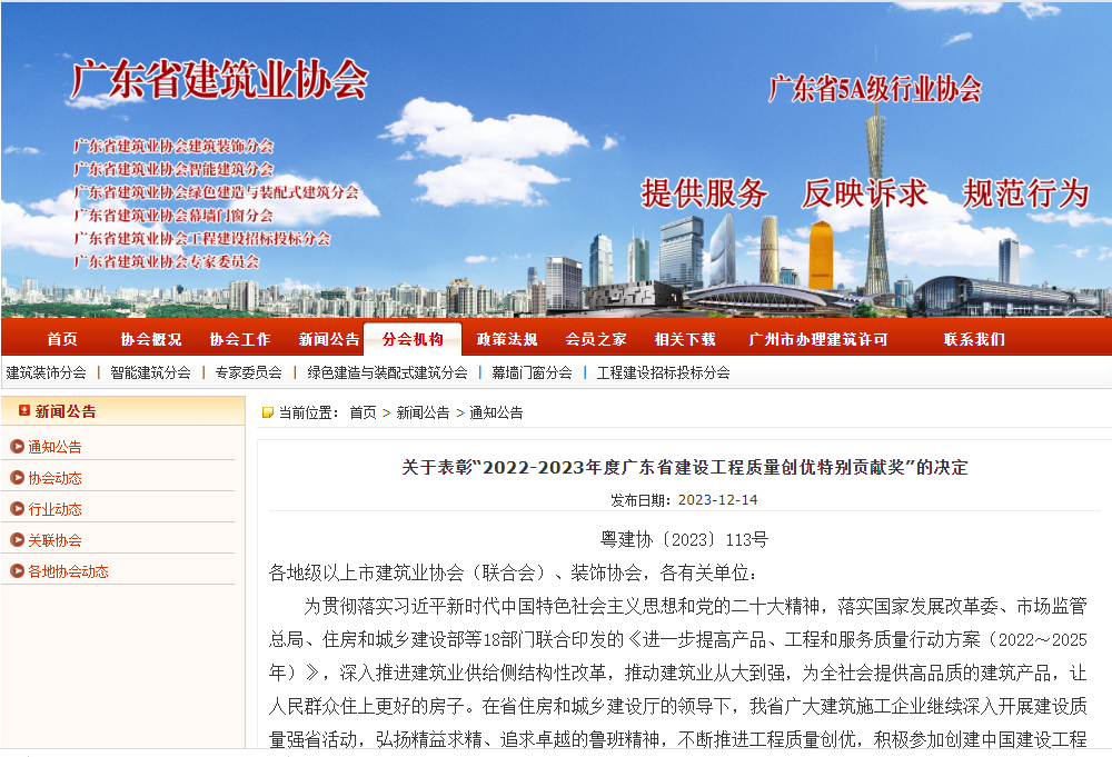 中裝建設(shè)獲2022-2023年度廣東省建設(shè)工程質(zhì)量創(chuàng)優(yōu)特別貢獻獎!