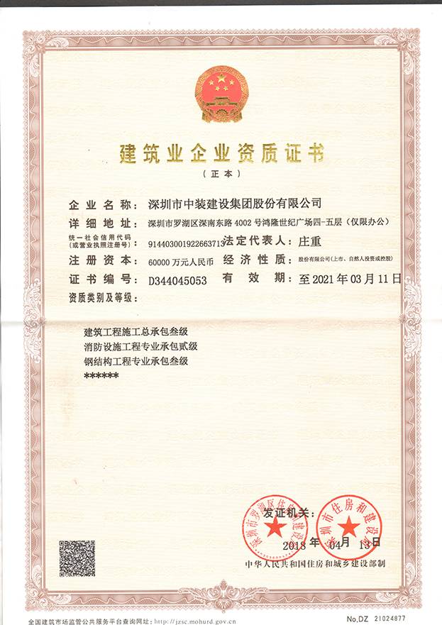 至此,中裝建設(shè)已經(jīng)具有建筑裝飾專項(xiàng)工程設(shè)計(jì)甲級(jí)、建筑裝修裝飾工程專業(yè)承包壹級(jí)、建筑幕墻工程專業(yè)承包壹級(jí)、電子與智能化工程專業(yè)承包壹級(jí)、建筑機(jī)電安裝工程專業(yè)承包壹級(jí)、防水防腐保溫工程專業(yè)承包壹級(jí)、展覽陳列工程設(shè)計(jì)與施工一體化壹級(jí)資質(zhì)、建筑工程施工總承包叁級(jí)資質(zhì)等行業(yè)從業(yè)資質(zhì)。